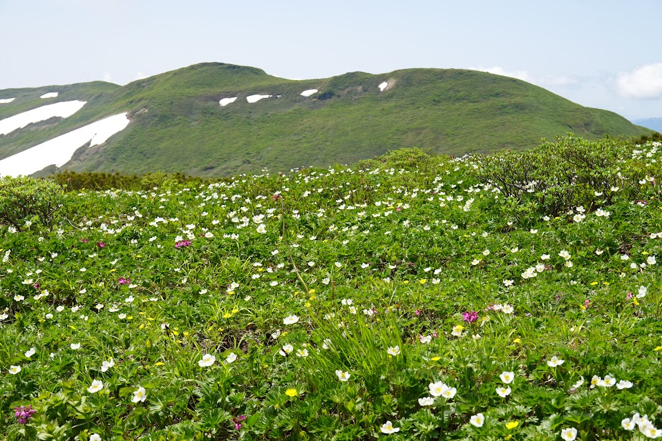 やはりここの花畑は素晴らしい。ハクサンイチゲとユキワリコザクラ、イワカガミ、ミヤマシオガマ、ミヤマキンバイ他の見事な混成群落。